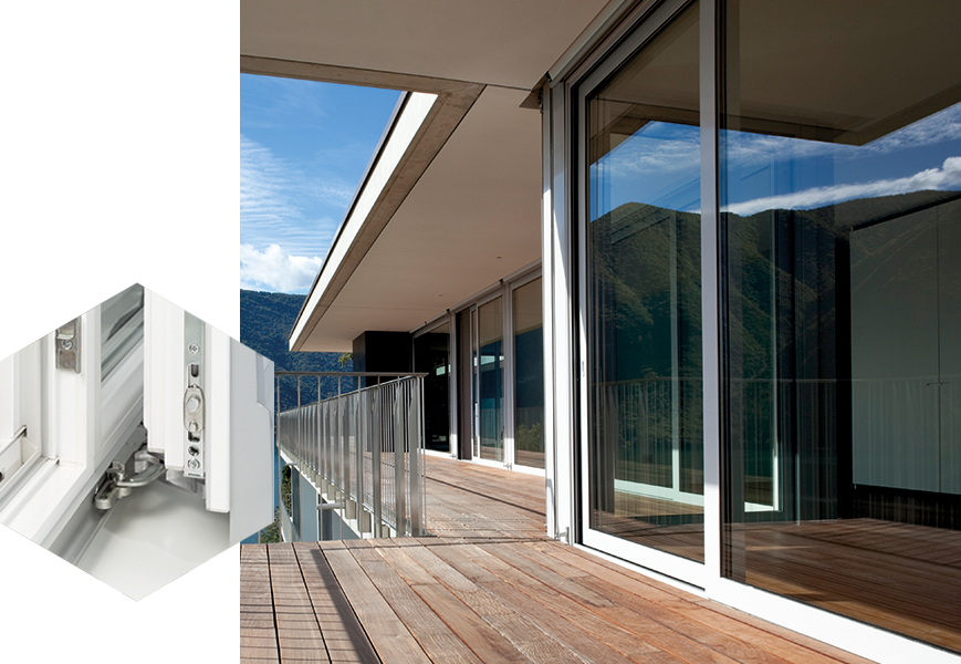 In this system for slide&tilt doors up to 200 kg made of PVC, timber, or timber-aluminium, the automatic opening and closing function is controlled centrally via the handle lever. A mishandling device can be optionally integrated. If the handle is in the opening position, the anti lock-out device prevents the sash from unintentional closing. The standard hardware is equipped with the i.S. security roller cam. This provides burglary protection, optimises the gasket compression setting and automatically compensates the air gap. A tandem roller is available for use above a sash weight of 160 kg.